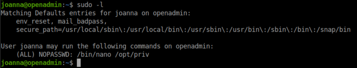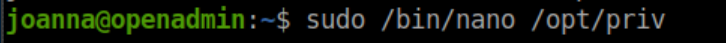 Running sudo -l shows us that Joanna can run /bin/nano /opt/priv as root:
