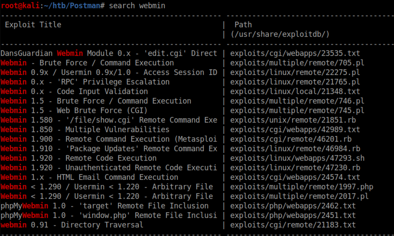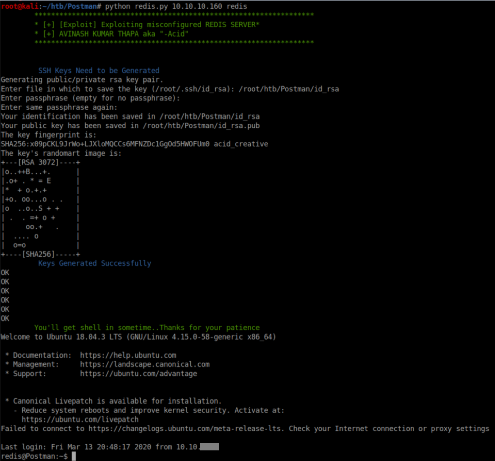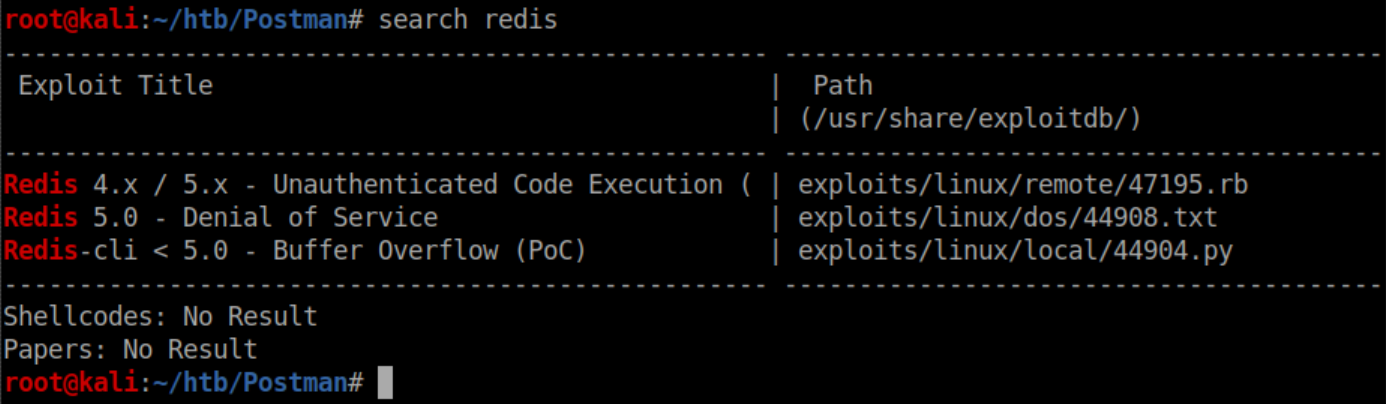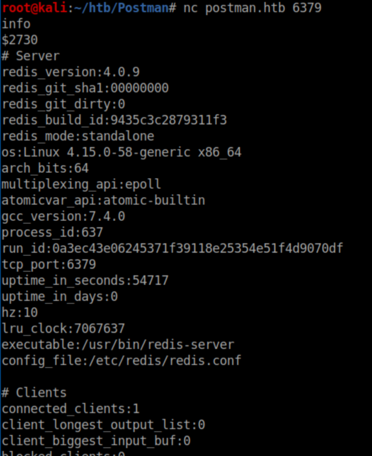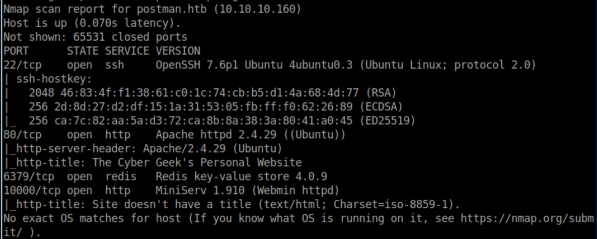 Postman was an easy rated box which was a short and fun romp. A vulnerability in redis lead to a low privilege shell then a ssh private key with a weak passphrase allowed lateral movement. Finally, password reuse combined with a Webmin exploit was used to get root access.