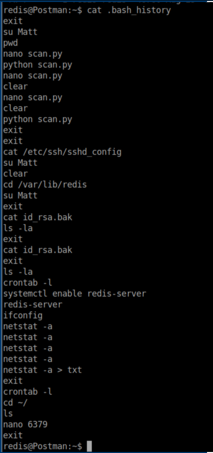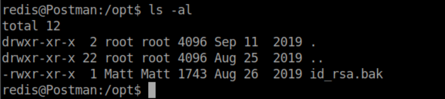 There are a couple of things to take away from this. The redis user uses the command su Matt quite a bit. Also, 'id_rsa.bak' caught my eye. I started enumerating the system and eventually found this file in /opt: