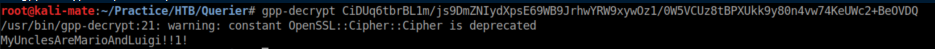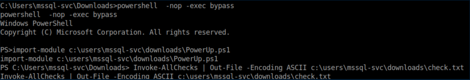 Alternatively, you can use PowerUp.ps1. After transferring it to Querier, I run it and save the output to check.txt: