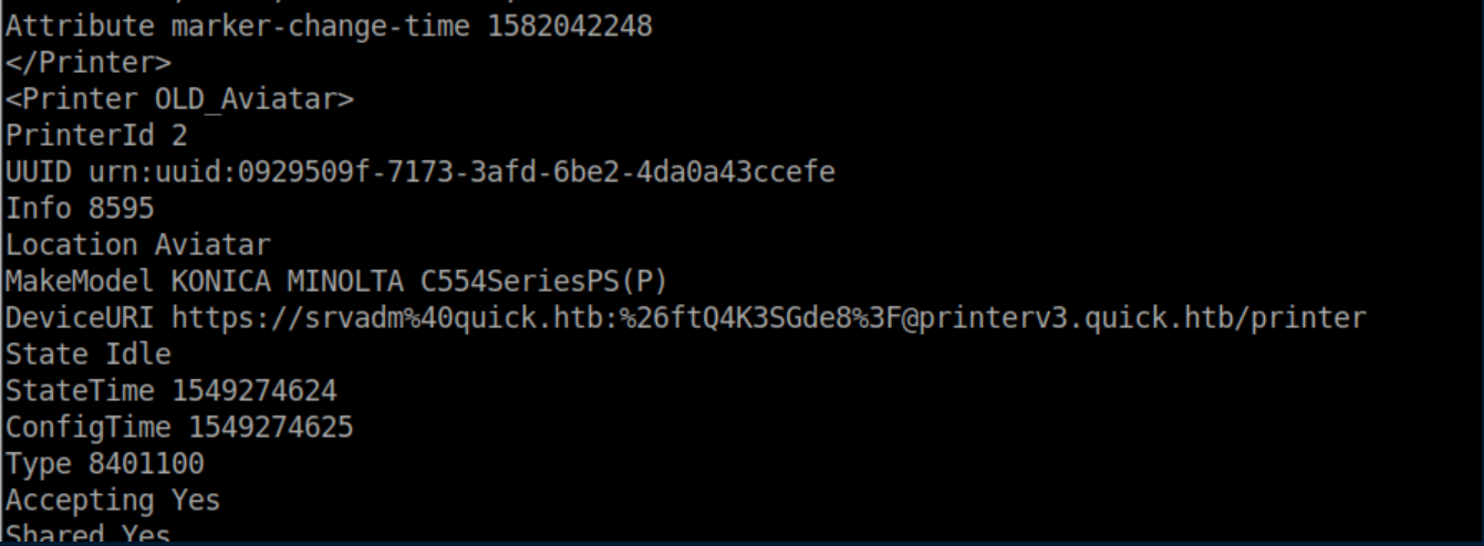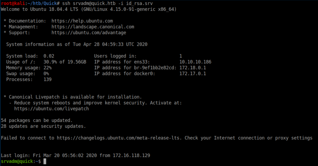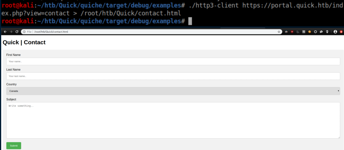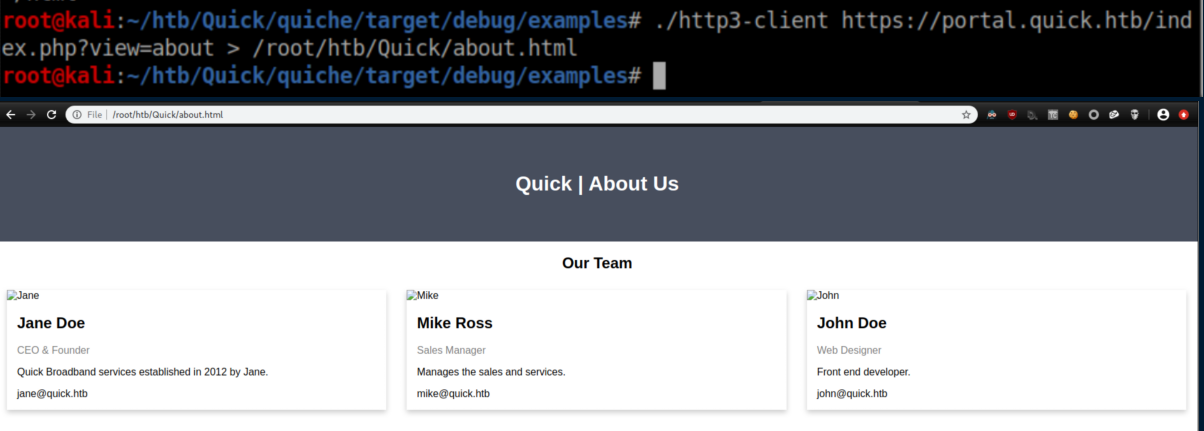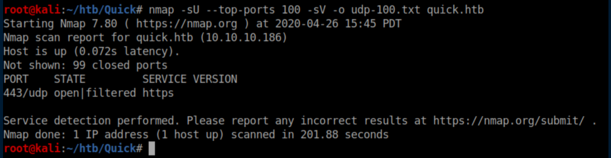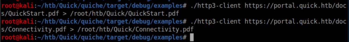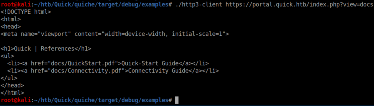 Quick was a hard rated Linux box and man, did it earn that rating. A website was accessed via the QUIC protocol and a password was retrieved. A list of potential usernames was compiled from the 'normal' website and used to spray the password and get past a login page. ESI injection was then performed to execute code and get a shell. A local print service was forwarded to the attacking machine through a SSH tunnel and a discovered MySQL password was used to login to it. A symlink was used to force the print server to connect to the attacking machine and send a higher-privileged user's private SSH key. Finally, a URL encoded password was found and used to su to root. I added quick.htb to /etc/hosts and dug in.