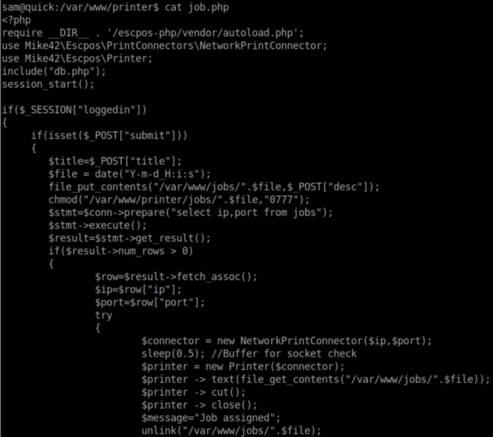 I'm not fluent in PHP at all but from what I could gather, the contents of /var/www/printer/jobs/$date are sent to the printer's network socket after the file is made world readable.