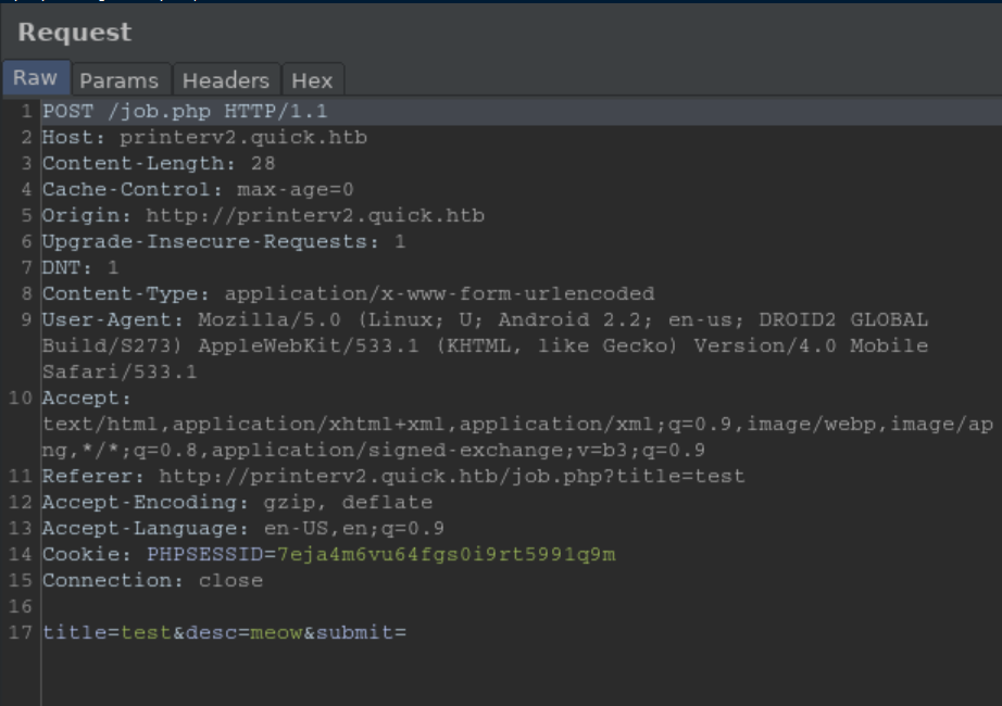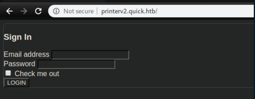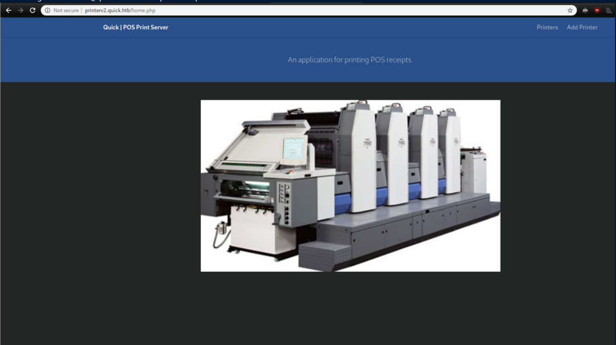 Next I edited /etc/hosts and pointed printerv2.quick.htb to localhost. With that done, I could finally load up the webpage: