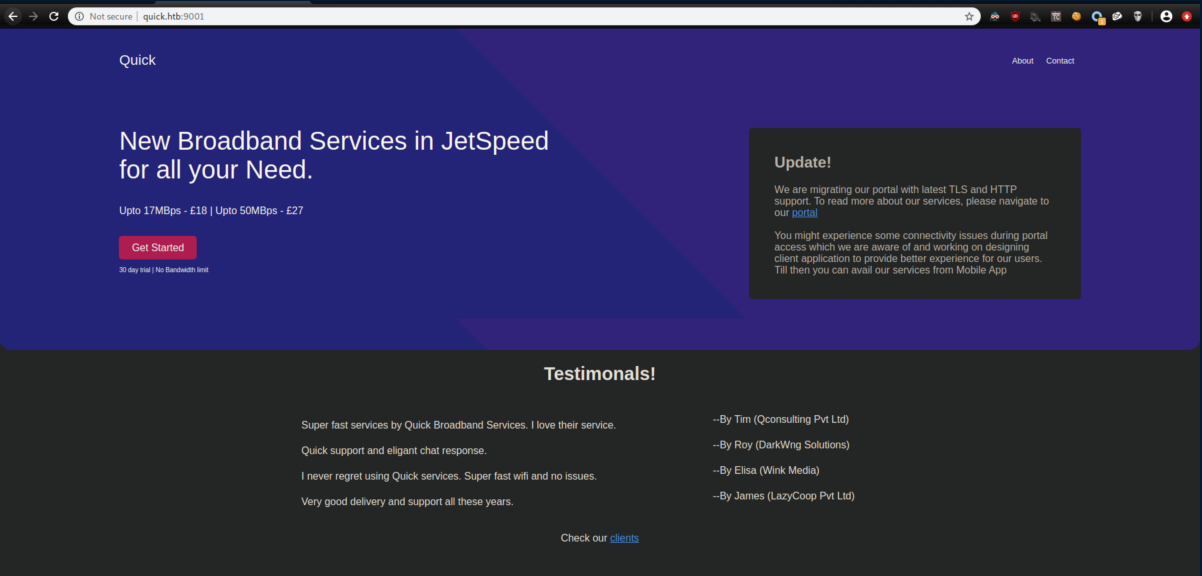 The 'portal' link leads to https://portal.quick.htb, so I added it to my /etc/hosts but it didn't work.