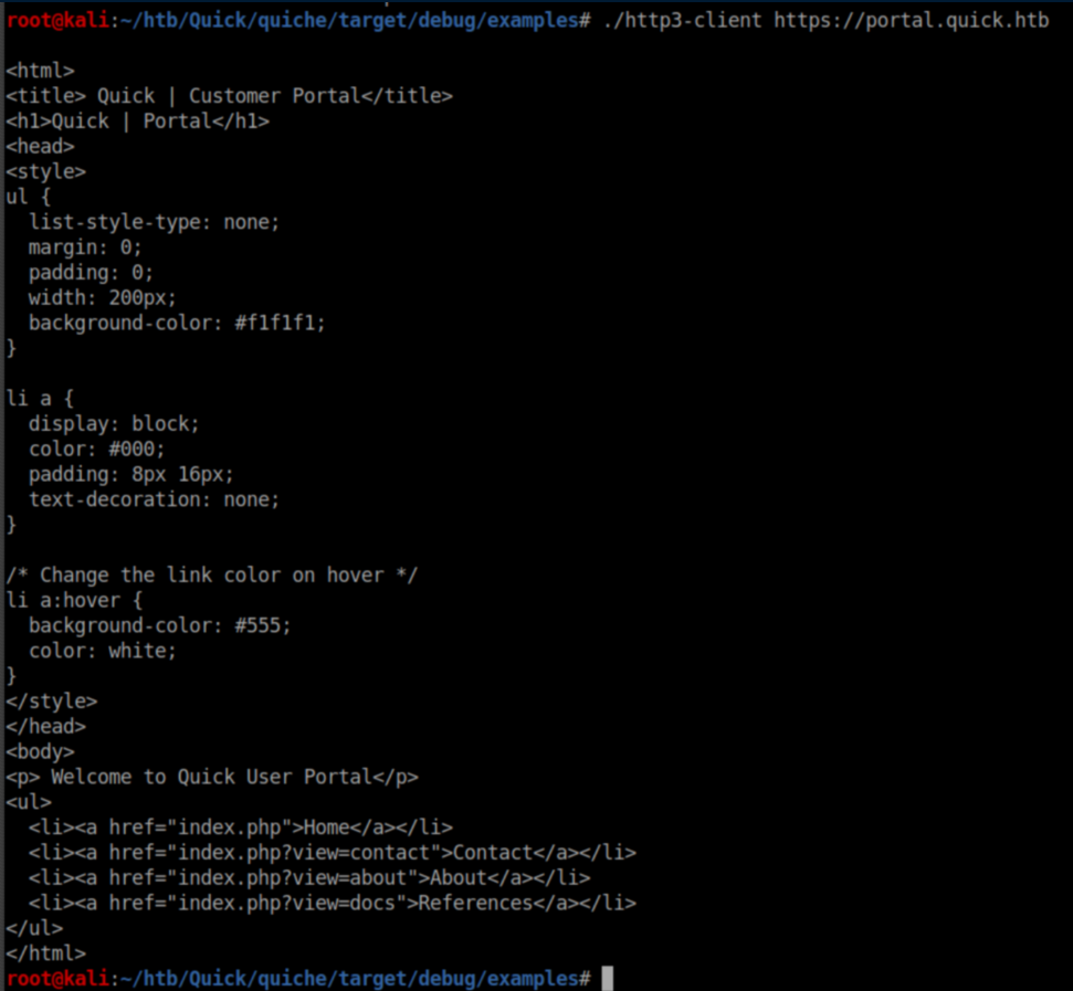 Some googling around and I learned about the QUIC protocol which was pretty interesting. I wasted hours trying to get experimental builds of curl to work - quiche and other libraries refused to play nice. I finally found this client that enabled me to move forward. Now that was working, let's check out the portal site that didn't work over TCP: