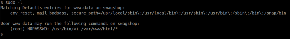 One of the first things I do when I get a shell on a Linux box is run sudo -l to see if my user can run anything as root: