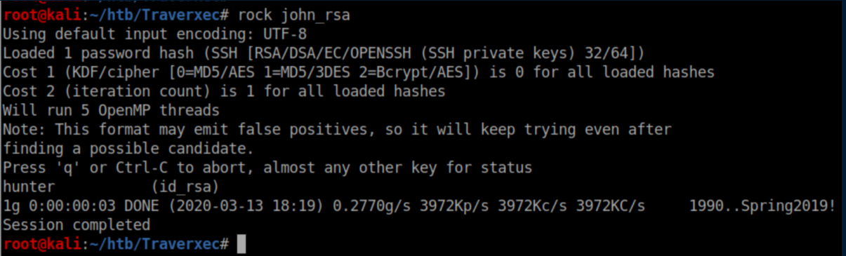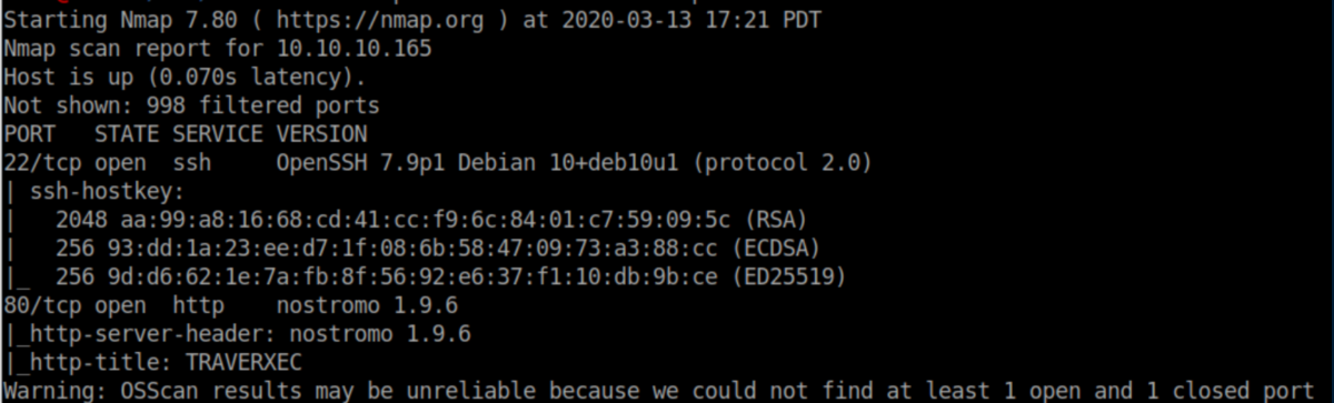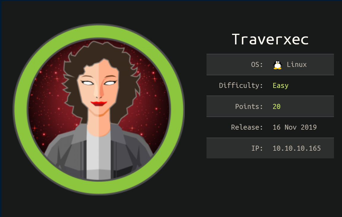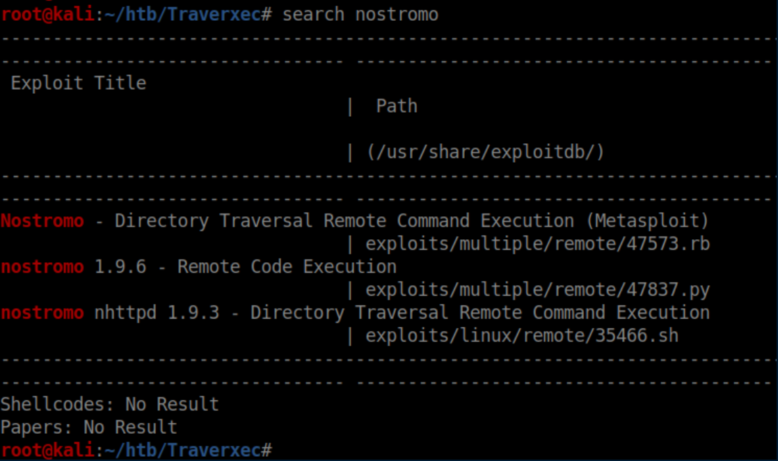 Traverexec was an easy rated Linux box which was great for beginners. A vulnerability in the Nostromo http server was exploited for initial access. A weak password used to protect a backup of ssh keys was cracked to pivot to another user. Finally, the binary less was abused to gain root privileges. Traverexec.htb was added to my /etc/hosts file so let's get started!