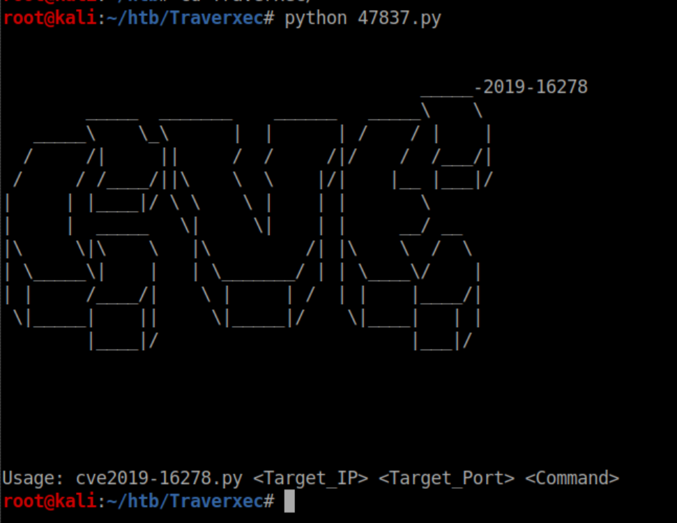 We see that there is an exploit matching the version of Nostromo available. We can copy the file to the working directory with the command searchsploit -m 47837.py. Running it shows what it expects for arguments: