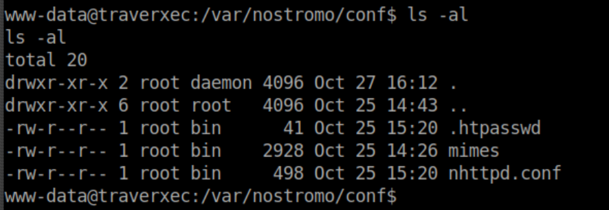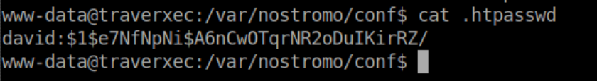 Here we see that basic authentication is used and the password is in /var/nostromo/conf/.htpasswd. Let's check out what's in that file: