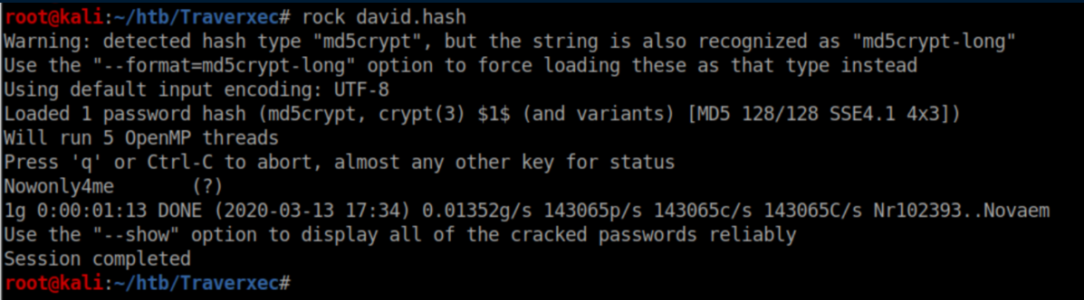 Beginner Breakdown: rock is a script I wrote that will try to crack a hash using John The Ripper and the infamous 'rockyou' wordlist. You can find it, and more, here. The hash has been successfully cracked revealing 'Nowonly4me'. This password does not let us ssh in as David so we set it aside and continue to enumerate the system.