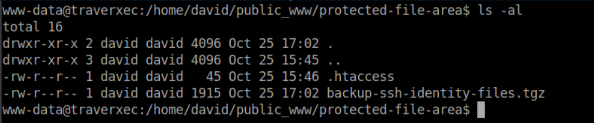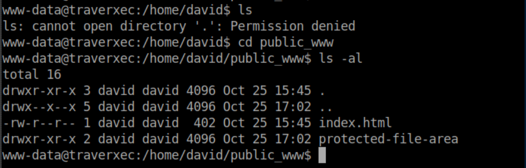 What this tell us is that a user's public webpage can be found in 'public_www'. Since this is publicly accessible, permissions have to be relaxed to allow this. We are interested in David's files, so we go to his home directory and see that we do not have permissions to list files. However, we have permissions to go to /home/david/www_data: