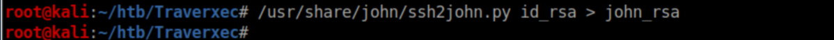 So, let's crack it! The first thing we need to do is prepare it for John The Ripper. ssh2john.py is used for this. I run it and write the output to john_rsa: