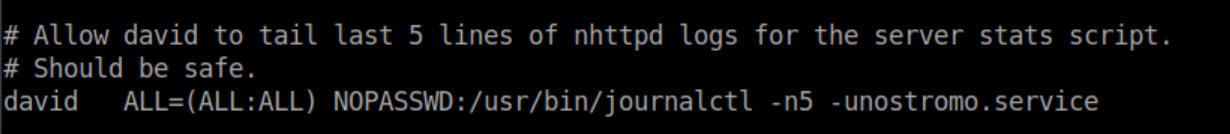 Beginner Breakdown: The/etc/sudoersfile controls what commands users may be allowed to run with sudo privileges. Below is the section that allows David to runjournalctlas root: