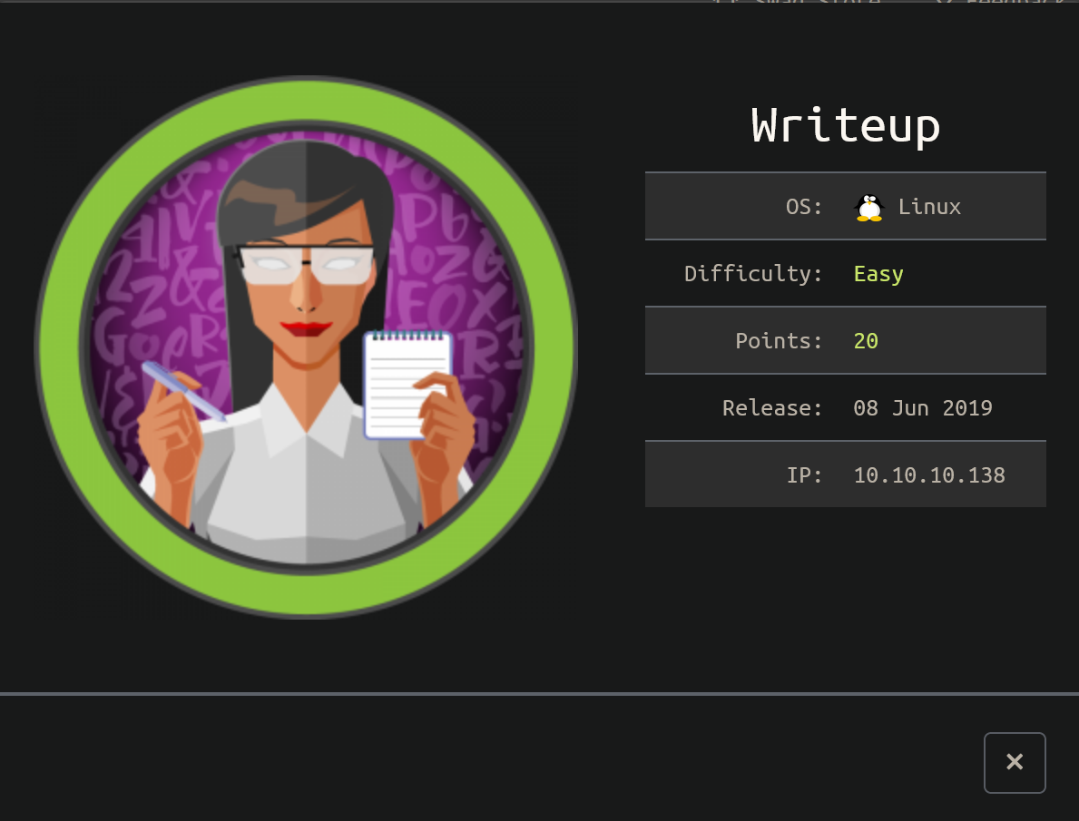 Writeup was an easy rated box - basic enumeration and exploitation for a foothold then abusing a bad path configuration with lax write permissions to escalate privileges to root.
