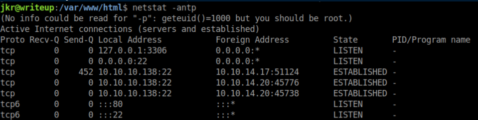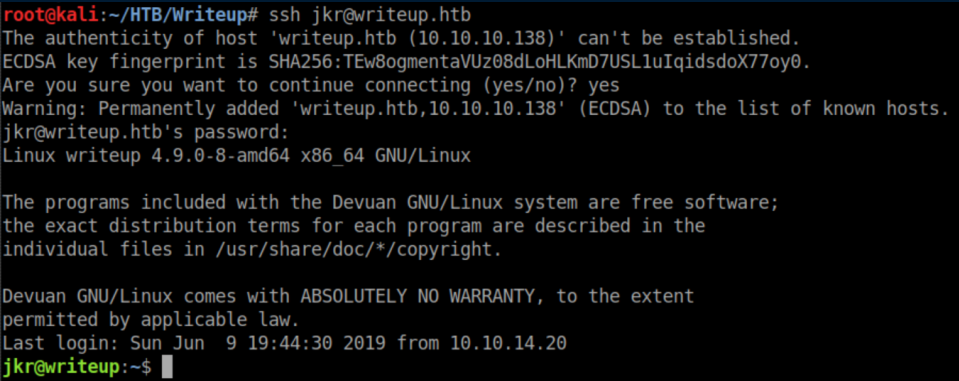 I logged out of the ssh session, logged back in as jkr over ssh and with a netcat listener, a root shell was caught: