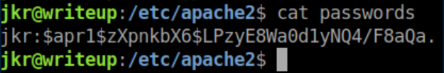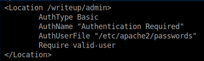 Unfortunately we do not have write access to that. I continued to enumerate further and found /etc/apache2/sites-enabled shows an auth file for http://writeup.htb/writeup/admin: