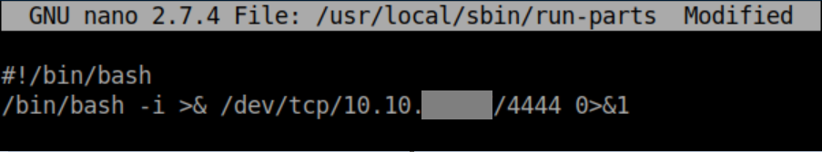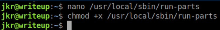 There are some funky permissions going on here: jkr has write access to /usr/local/sbin and /usr/local/bin but cannot list the contents of those directories. You'll notice that run-parts does not have the full path so we can take advantage of this. I create a file /usr/local/sbin/run-parts using nano: