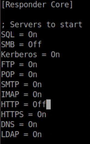 The first step is to edit /etc/responder/Responder.conf and disable the SMB and HTTP listeners: