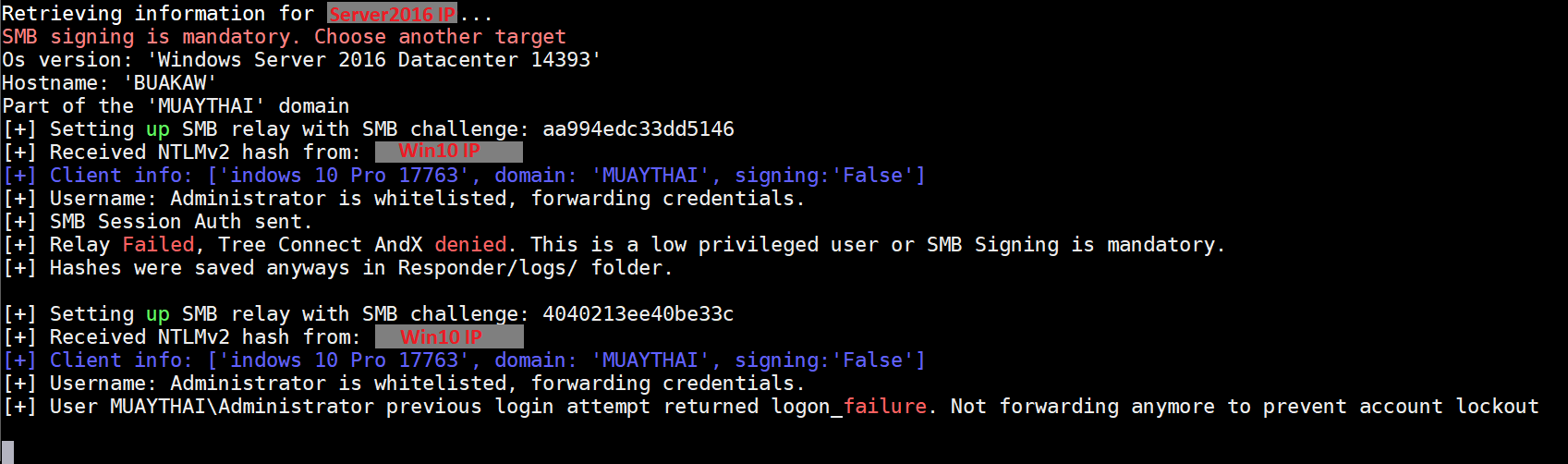 This is what an attacker will see if they try to run MultiRelay.py against a machine with SMB Signing enabled: