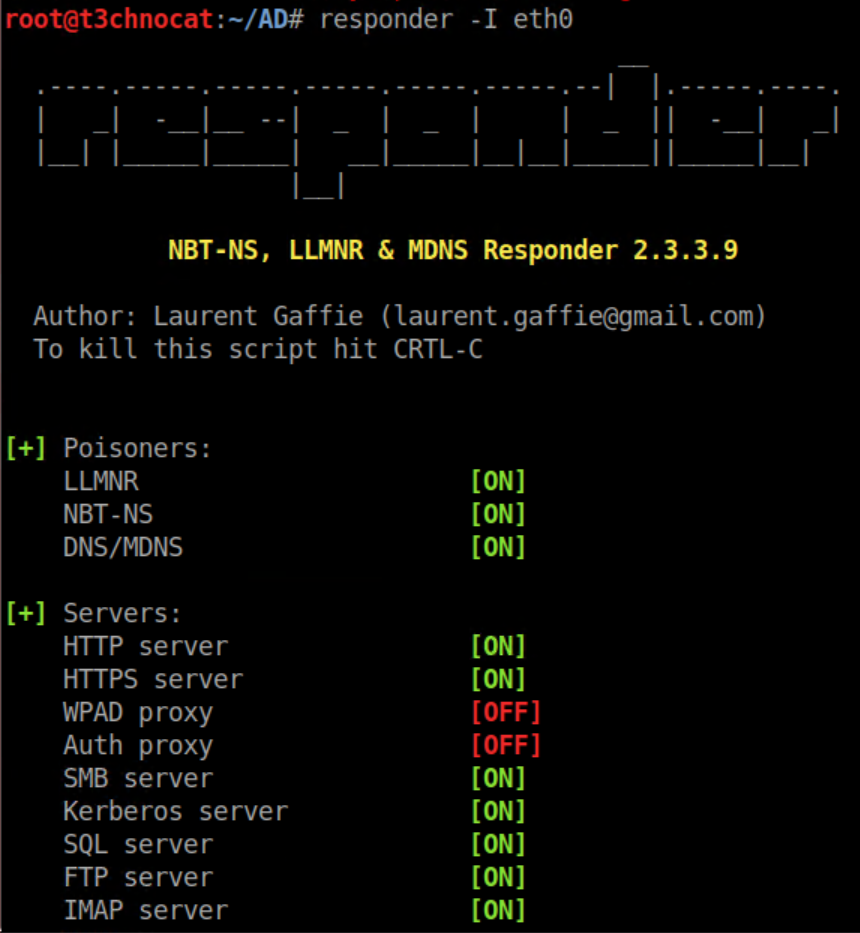 Responder comes pre-installed in Kali and running responder -I <network interface> will get it started: