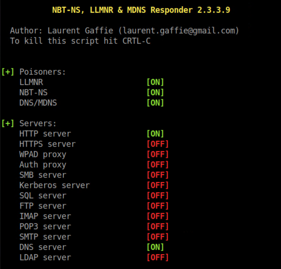 I found that I didn't need to mess around with options and simply starting Responder with responder -I <nic> worked just fine - you should see something like this come up: