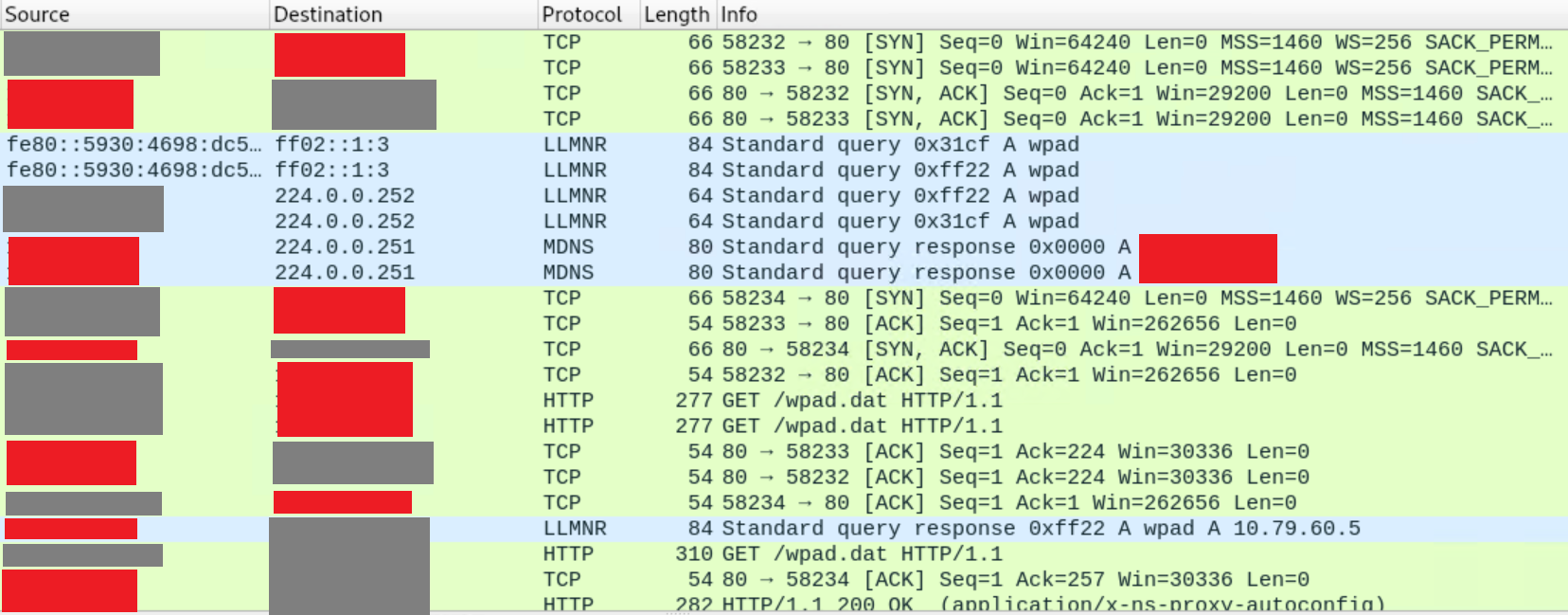 Here you see the victim connect to the attacker on port 80 and download wpad.dat. If you plan on hosting the wpad.dat file elsewhere on your own, take note of the HTTP application type - it needs to be "application/x-ns-proxy-autoconfig".