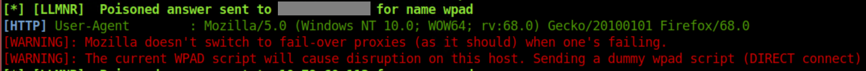 Just like what happened in my other tutorial on Windows SMB attacks, since there is no DNS entry for 'wpad' or 'wpad.local', the victim started broadcasting 'Yo!! I'm looking for wpad or wpad.local!' and Responder uh, responded with 'Hey, that's me!'. Then: